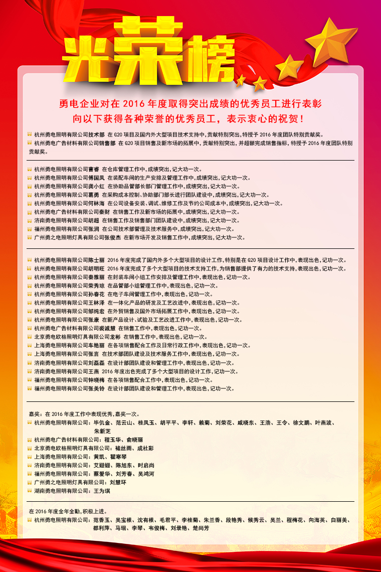 轉瞬之間,2016年已成昨天。在過去的一年里,勇電照明的團隊涌現出眾多優秀的員工,他們在平凡的崗位上創造了不平凡的業績。現將勇電照明2016年度優秀員工榮譽榜公布如下: