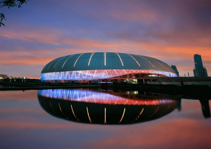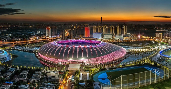 臨水而建、依水而起,占地面積8萬平方米,觀眾座席6萬個,建筑外形狀如水滴,能夠滿足國際足球、世界田徑比賽需求的水上體育館。
