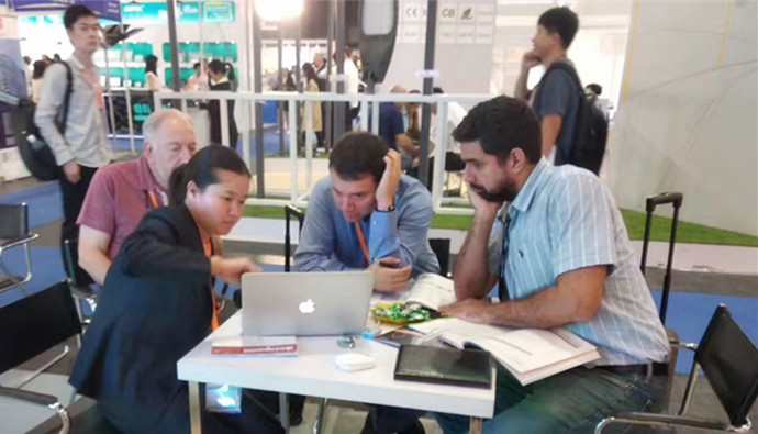 國內外參觀團齊聚勇電展位,了解產品資訊,大家對“二次封裝”和“體感互動屏”特別感興趣。勇電員工以實際項目為例,為大家仔細講解產品在實景中的應用。聲情并茂又幽默風趣的講解,讓各位觀展商聽得津津有味兒!